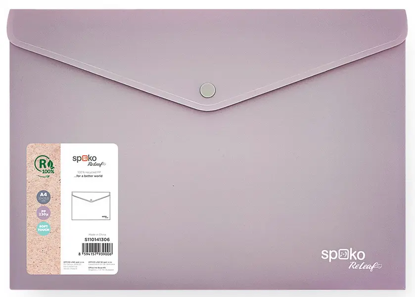 uzavírání na klopu s drukem • materiál silný polypropylen 230 mic. ze 100 % recyklovaný • úprava materiálu SoftTouch • certifikace Global Recycled Standard • barva: fialová • formát A4