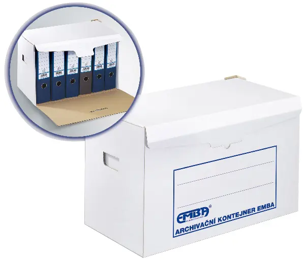 rozměr 500 x 300 x 330 mm • kapacita 6 ks pořadačů 80 mm nebo 10 ks pořadačů 50 mm • materiál kvalitní třívrstvá vlnitá lepenka B/H • otvírání z boku • pro uložení a přepravu archivovaných dokumentů • možnost stohování • nosnost 100 kg • barva bílá •