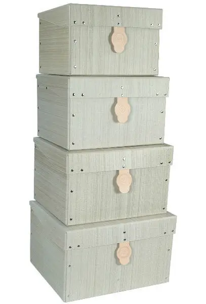 4 ks do sebe složených krabic s rozměry: 264 x 203 x 161 mm, 286 x 222 x 174 mm, 308 x 241 x 187 mm a 330 x 260 x 200 mm • materiál exkluzivní hladká lepenka Luxor natur • luxusně provedené • ručně zhotovené • odklápěcí víko • kožená pečeť kvality