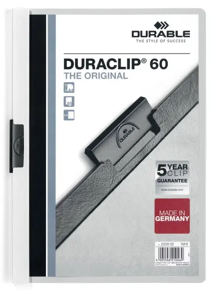 formát A4 • plastové desky se sponou ze speciální oceli • průhledná přední a barevná zadní strana • vhodné pro archivaci a prezentaci neděrovaných dokumentů • snadné a rychlé zakládání a vyjímání dokumentů • prodloužená záruka na klip 5 let • kapacita: 60 listů • barva: bílá