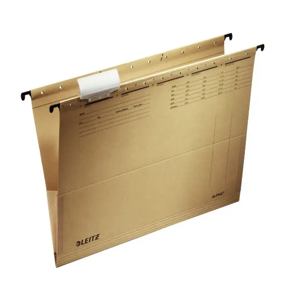 formát A4 • rozpětí vodicích lišt 330 mm • materiál hnědého provedení recyklovaný karton 250 g, materiál barevného provedení karton 225 g • bočnice speciální plátnový materiál • plastový rozlišovač s vyměnitelným papírovým štítkem • vhodné pro ukládá