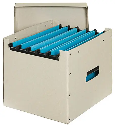 pro formát A4 • vnitřní rozměr 325 x 279 x 270 mm • kapacita 20 závěsných desek • materiál lepenka • pro archivaci dokumentů uložených v závěsných deskách • otvory pro ruce • nýtovaná konstrukce • plastové lišty