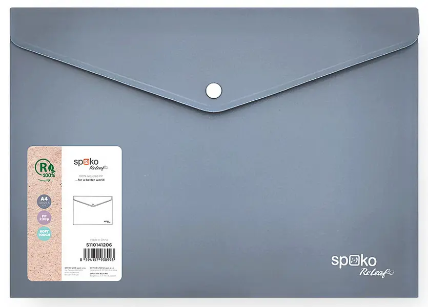 uzavírání na klopu s drukem • materiál silný polypropylen 230 mic. ze 100 % recyklovaný • úprava materiálu SoftTouch • certifikace Global Recycled Standard • barva: šedá • formát A5