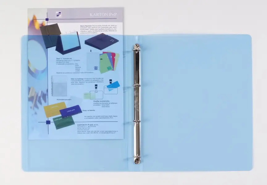 formát A4 • šíře hřbetu 20 mm • kapacita 70 listů • čtyřkroužková mechanika R15 • průměr kroužků 15 mm • materiál polypropylen 600 mic. • čirá kapsa na titulní straně
