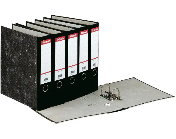 formát A4 • páková mechanika • vnější potah tmavý mramorovaný papír • vnitřní potah světlý mramorovaný papír • barva hřbetu černá • hřbetní kroužek pro snadnou manipulaci • kovové lišty pro delší životnost • uzavírací kroužky proti náhodnému otevření