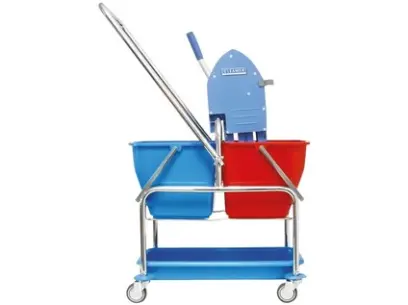 skládá se z odolného chromovaného rámu, na kterém jsou uložena dvě vědra 17 litrů, ždímač, vanička, kovová rukojeť • prostor pod vědry je vybaven vaničkou 60 x 18 cm, kterou lze využít pro uložení úklidových pomůcek, nebo na odkládání sáčků s odpadem