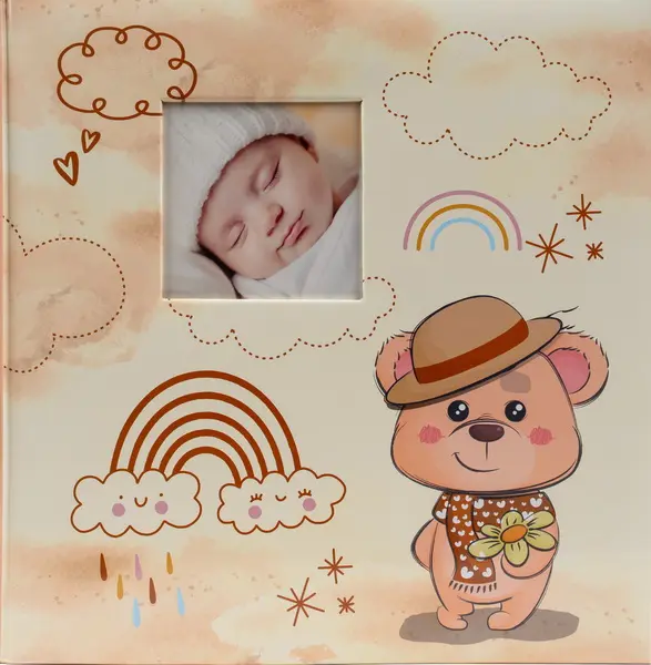 Jedná se o roztomilé dětské fotoalbum s laminovanou obálkou v jemné oranžovo-béžové barvě. Album má šitou vazbu, která zaručuje jeho dlouhou životnost. Je určeno pro uchování až 500 fotografií formátu 10 x 15 cm, které se vkládají zasouváním. U každé fotografie je prostor pro popisky. Listy jsou vyrobeny z bílého papíru. Na obálce je vyobrazen veselý motiv medvídka s kloboukem, duhou a obláčky. V horní části obálky je okénko pro vložení vlastní vyměnitelné fotografie, což dodává albu osobní ráz. Je to skvělý dárek pro novopečené rodiče k uchování vzpomínek na první roky života dítěte.