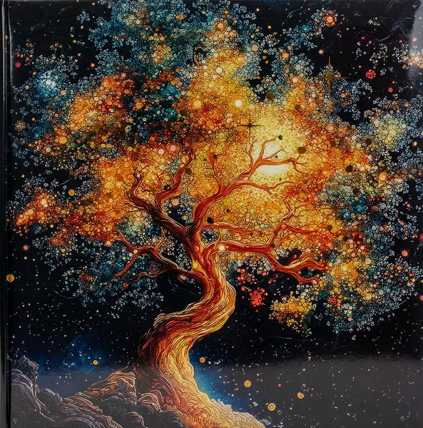 Jedná se o elegantní fotoalbum s laminovanou obálkou v černé barvě s motivem. Album má šitou vazbu, která zaručuje jeho dlouhou životnost. Je ideální pro uchování 200 fotografií formátu 10 x 15 cm, které se vkládají zasouváním dvě nad sebou. Mezi fotografiemi je prostor pro vkládací popisky. Listy jsou vyrobeny z bílého papíru. Na obálce je vyobrazen fantastický motiv zářivého stromu života nebo "magického" stromu s korunou tvořenou zlatými a barevnými jiskřivými body, na tmavém, hvězdném pozadí. Hřbet alba je lesklý černý. Díky svému modernímu a poutavému motivu je album ideální pro uchování vzpomínek z cest, přírody nebo jiných cenných zážitků, kterým chcete dodat nádech výjimečnosti.