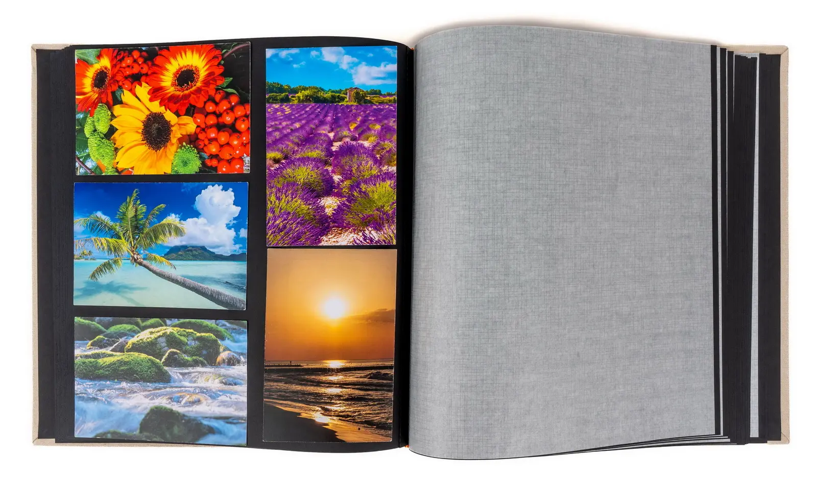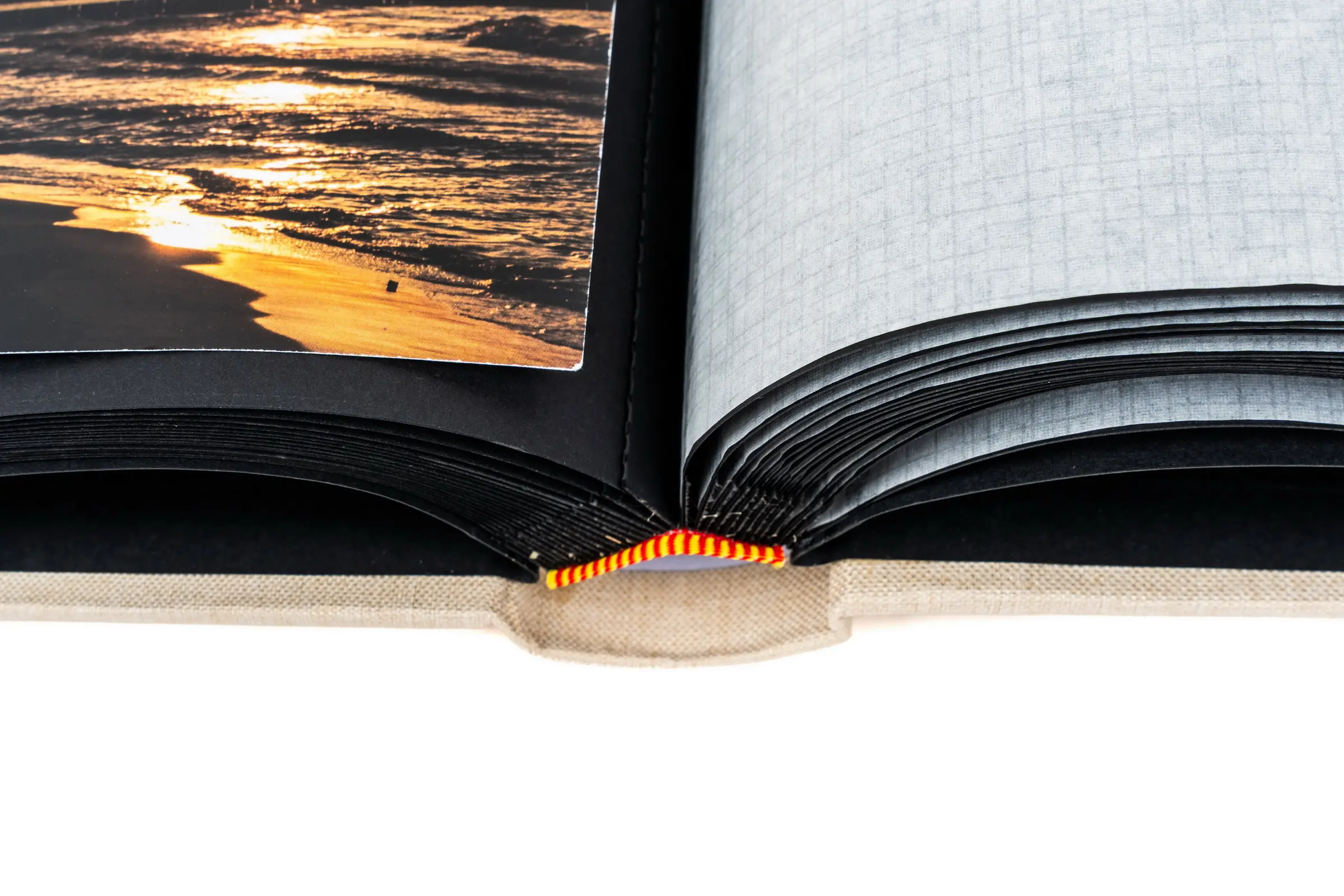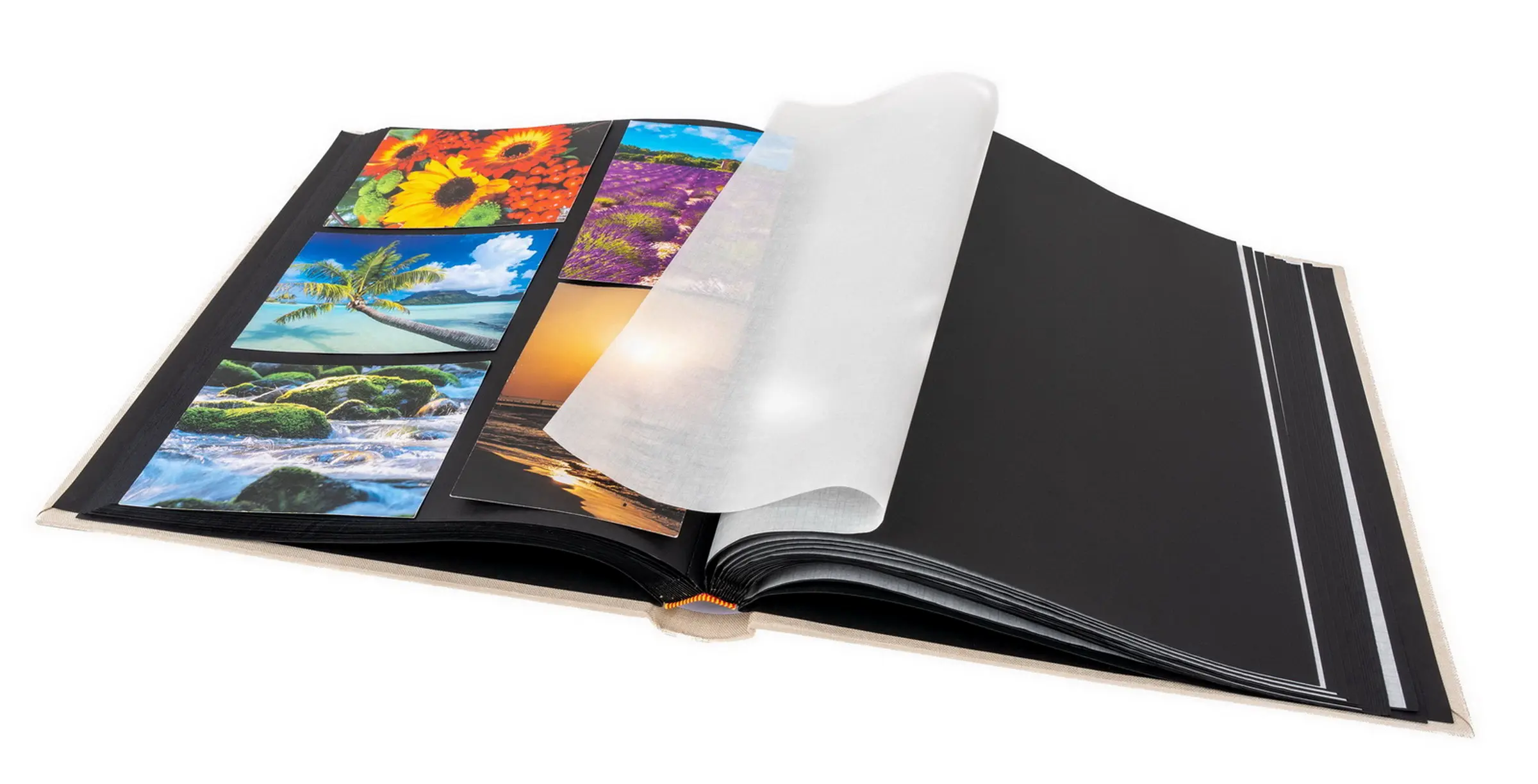 klasické fotoalbum, 60 stran, rozměr alba 31 x 33 cm, rozměr listu 29 x 32 cm, dělící pergamenové listy, černé listy, šitá kniha