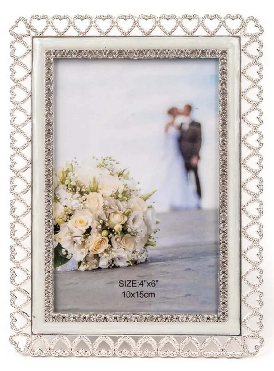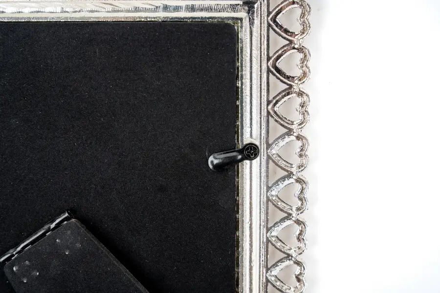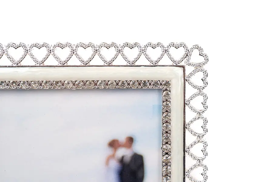 kovový fotorámeček, foto 10 x 15 cm, rozměr rámečku 14,5 x 19,5 cm, šířka lišty 2,3 cm, k postavení vertikálně i horizontálně, fotografie je krytá sklem