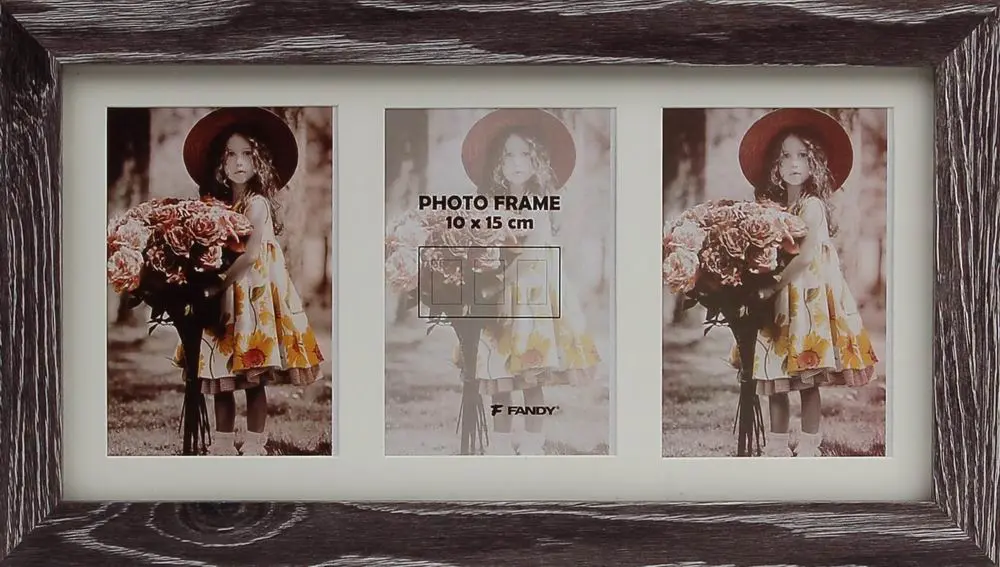 dřevěný rámeček na 3 foto 10 x 15 cm, rozměr rámečku 41,5 x 23,5 cm, k zavěšení vertikálně i horizontálně, šířka lišty 2,8 cm, fotografie krytá sklem, fotografie je krytá sklem