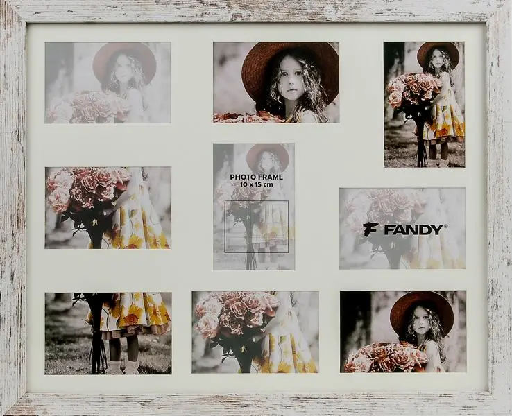 dřevěný rámeček na 2 foto 10 x 15 cm a 7 foto 15 x 10 cm, rozměr rámečku 56,6 x 46,6 cm, k zavěšení vertikálně i horizontálně, šířka lišty 2,8 cm, fotografie je krytá plexisklem