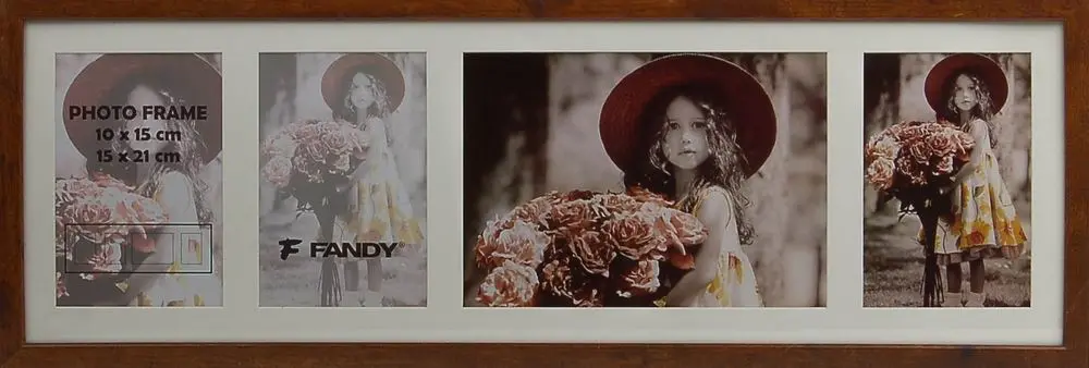 dřevěný rámeček na 3 foto 10 x 15 cm a 1 foto 15 x 21 cm, rozměr rámečku 61,5 x 21 cm, k zavěšení vertikálně i horizontálně, šířka lišty 1,5 cm, fotografie je krytá sklem