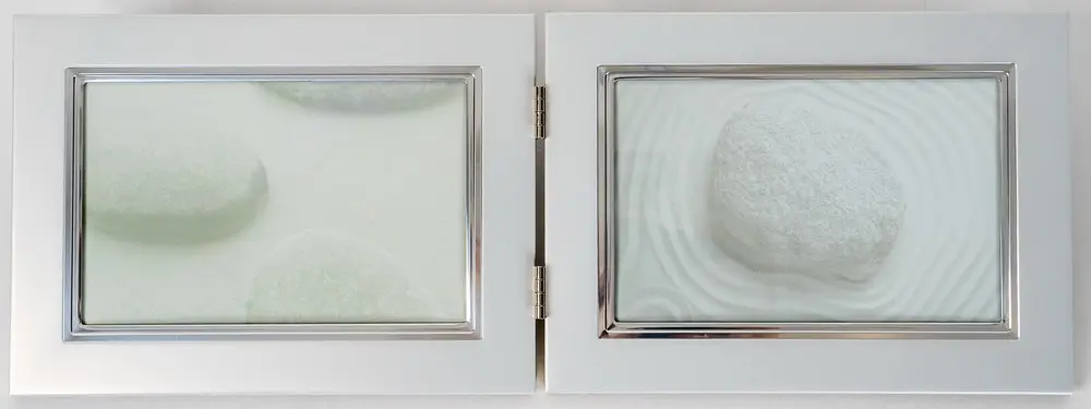 kovový rámeček, 2 foto 18 x 13 cm, rozměr rámečku 43,5 x 16,5 cm, k postavení, šířka lišty 2,5 cm, fotografie je kryta sklem