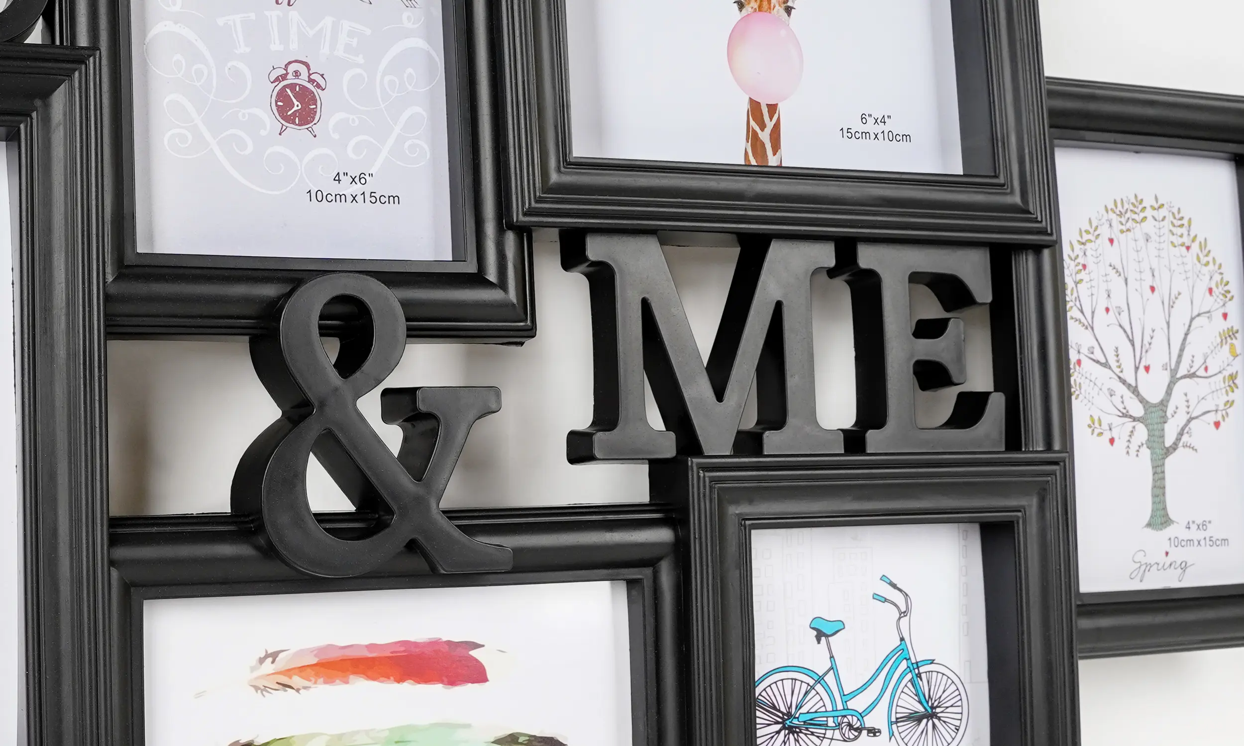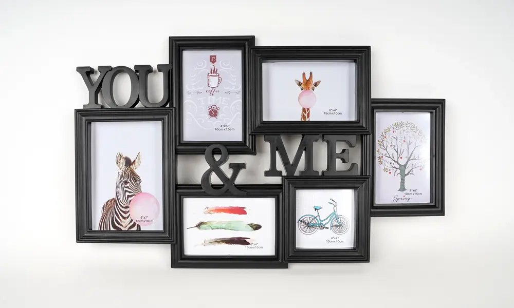plastový rámeček na 4 foto 10 x 15 cm, 1 foto 10 x 10 cm a 1 foto 13 x 18 cm, rozměr rámečku 57 x 36 cm, k zavěšení, fotografie je krytá plexisklem