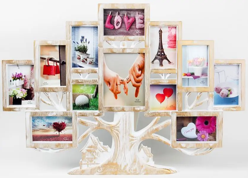 plastový rámeček na 9 foto 10 x 15 cm, 2 foto 10 x 10 cm a 1 foto 15 x 20 cm, rozměr rámečku 82 x 58 cm, k zavěšení, fotografie je krytá plexisklem