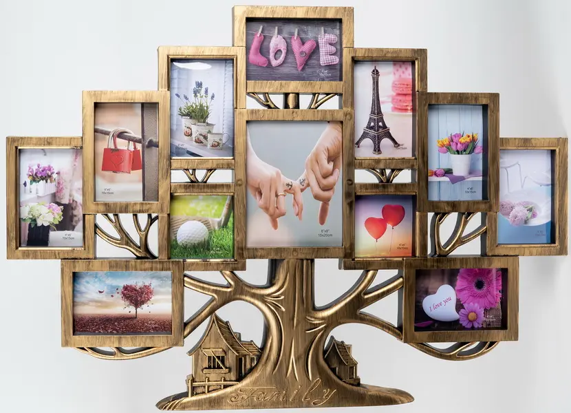 plastový rámeček na 9 foto 10 x 15 cm, 2 foto 10 x 10 cm a 1 foto 15 x 20 cm, rozměr rámečku 82 x 58 cm, k zavěšení, fotografie je krytá plexisklem