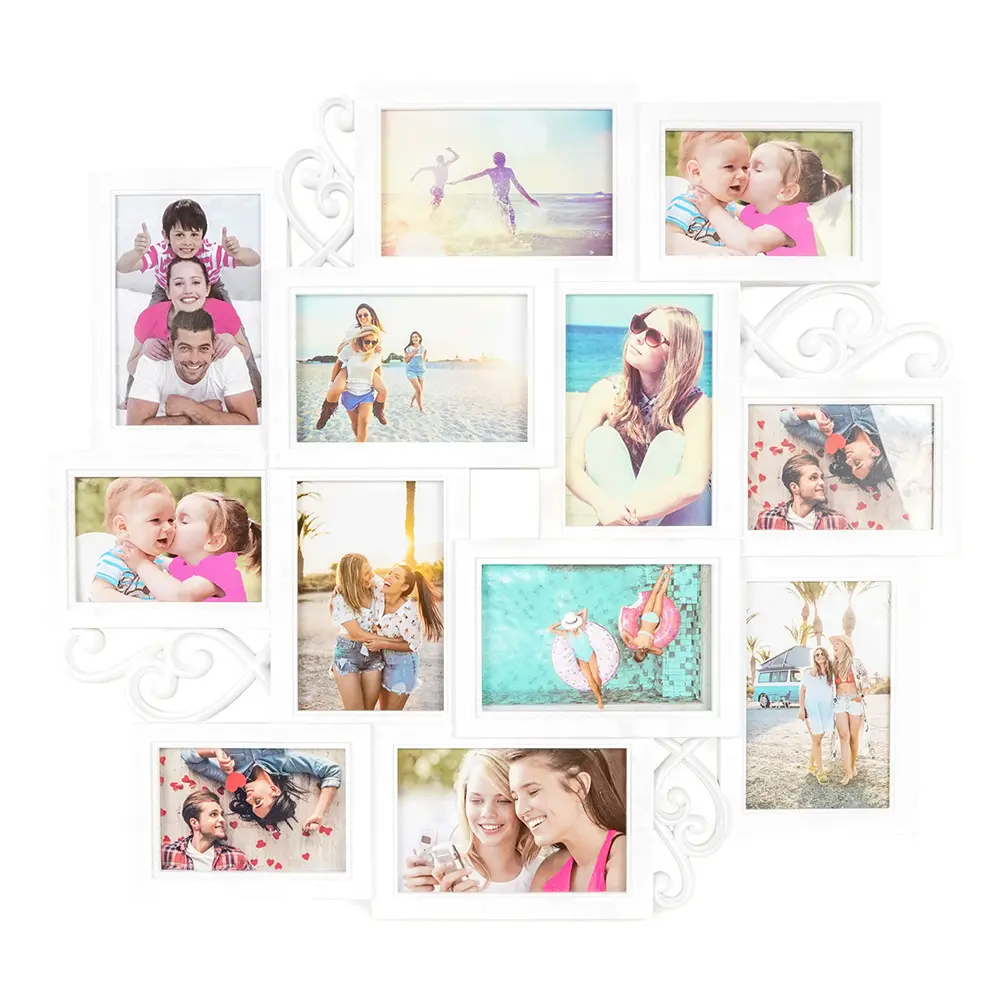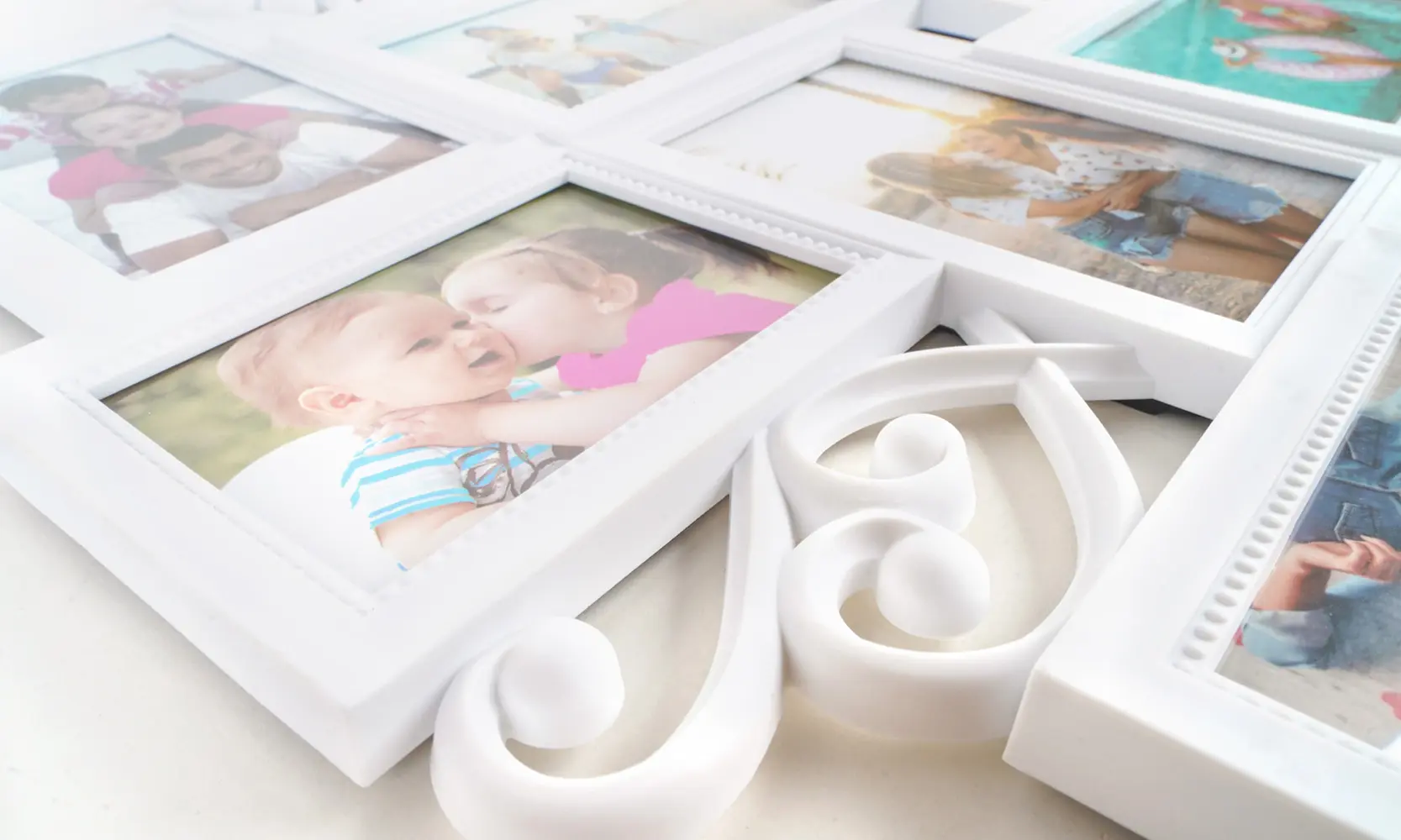 plastový rámeček na 8 foto 10 x 15 cm a 4 foto 9 x 13 cm, rozměr rámečku 55 x 50,5 cm, k zavěšení, fotografie je krytá plexisklem
