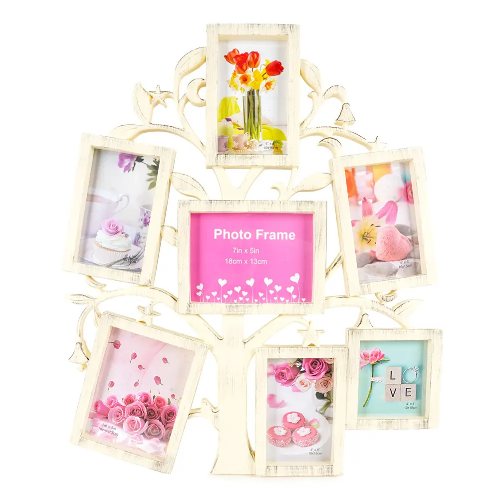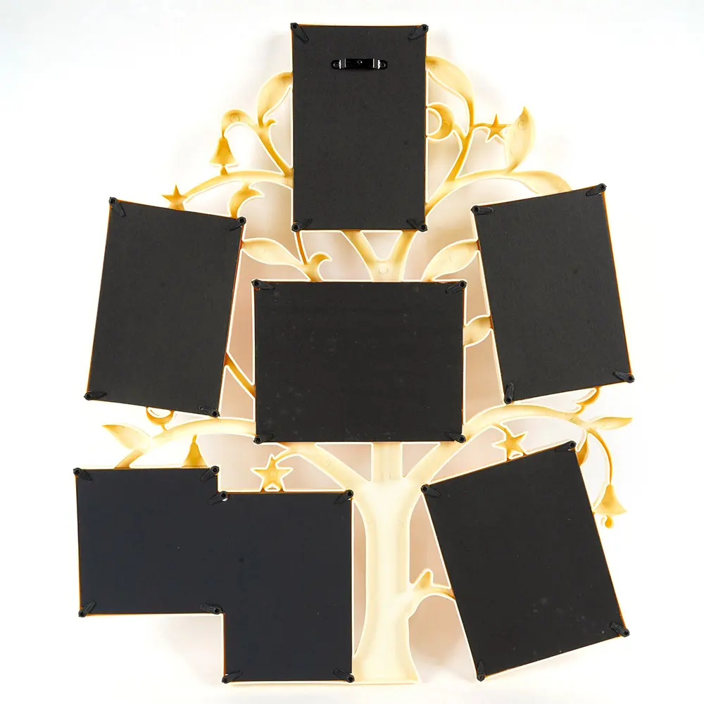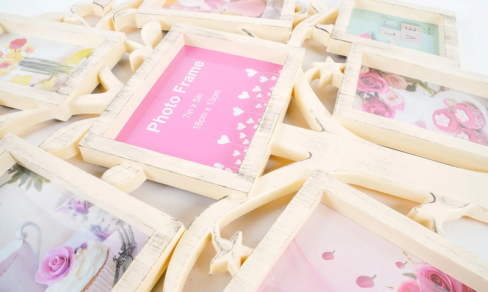 plastový rámeček na 4 foto 10 x 15 cm, 2 foto 13 x 18 cm a 1 foto 10 x 10 cm, rozměr rámečku 53,5 x 45 cm, k zavěšení, fotografie je krytá plexisklem
