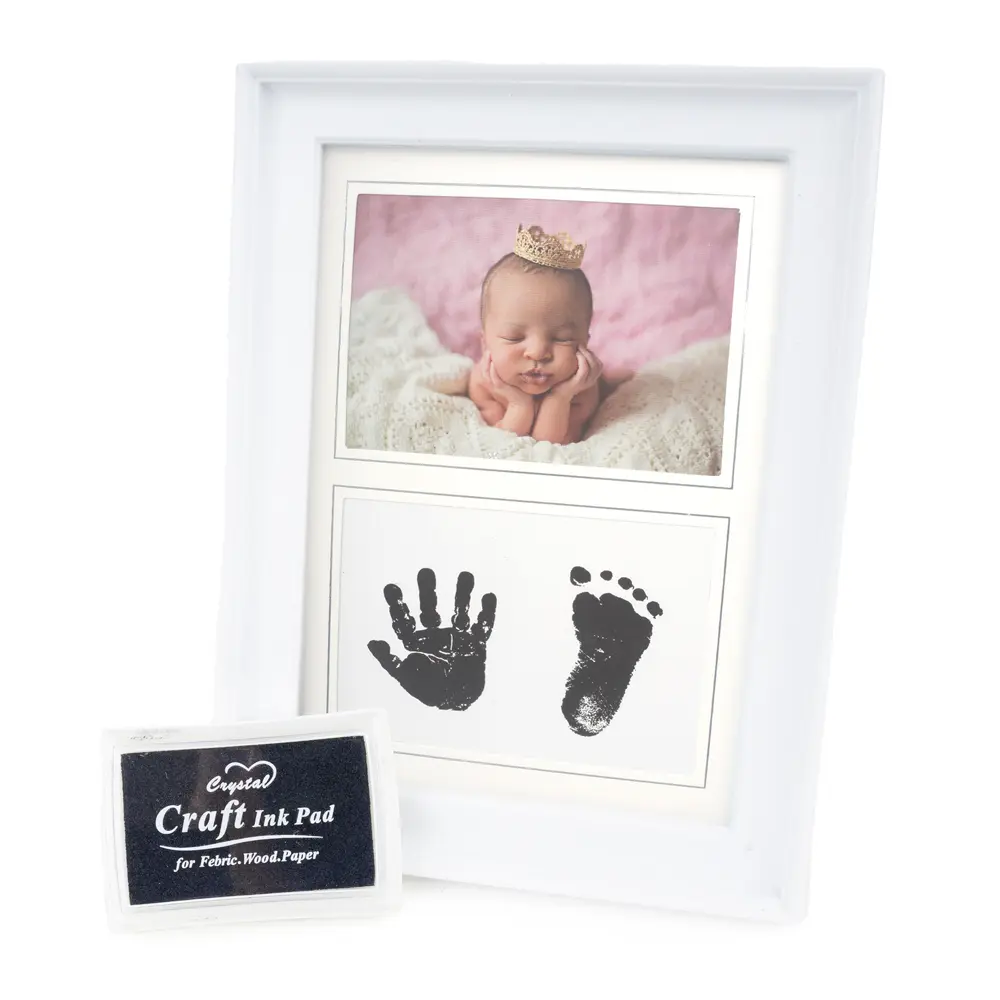 plastový fotorámeček, rozměr rámečku 15,5 x 20,6 cm, šířka lišty 2 cm, k postavení nebo zavěšení, součástí je inkoustová poduška pro vytvoření otisku ručičky nebo nožičky dítěte, fotografie je krytá sklem