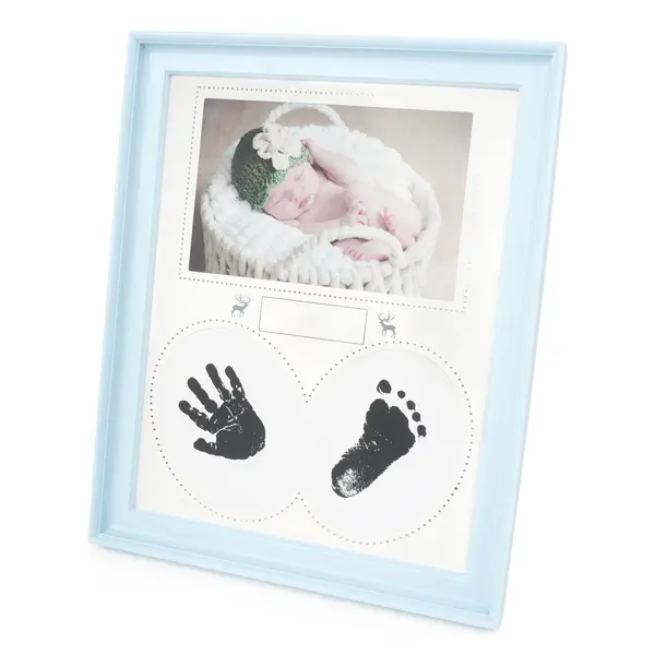 plastový fotorámeček, rozměr rámečku 22,2 x 27,4 cm, šířka lišty 2 cm, k postavení nebo zavěšení, součástí je inkoustová poduška pro vytvoření otisku ručičky nebo nožičky dítěte, fotografie je krytá sklem