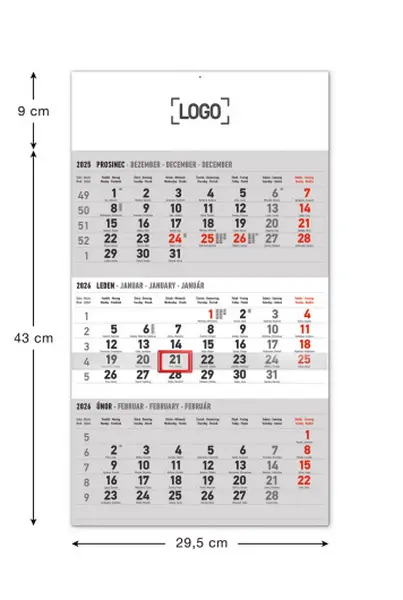 Praktický plánovací kalendář s tříměsíčním rozložením a orientační lištou s posuvným jezdcem. Obsahuje kalendárium s českými jmény a světovými svátky na šedém pozadí.