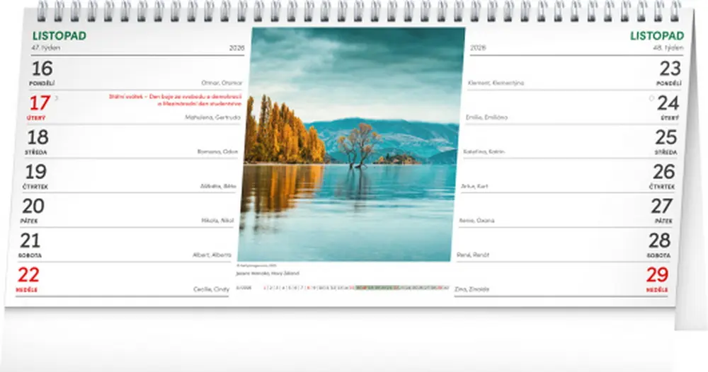 Ve 14-denním stolním kalendáři na vás čekají úchvatné záběry krajiny z celého světa, dále české kalendárium, svátky a památné dny i měsíční fáze. To vše v přehledném dvoutýdenním rozvržení.