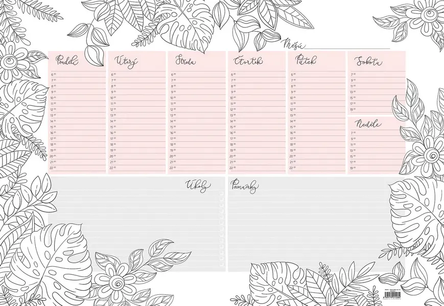30 listů • papírová • týdenní kalendárium s omalovánkou • lepená vazba • balená ve fólii