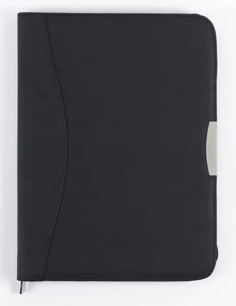 formát A4 • imitace černé kůže • obšité • mechanika - klip • uzavíratelné zipem • hřbet 35 mm • poznámkový blok A4 • kapsa na kreditní karty a doklady • vložky na vizitky a CD • úchyty na psací potřeby • barva černá