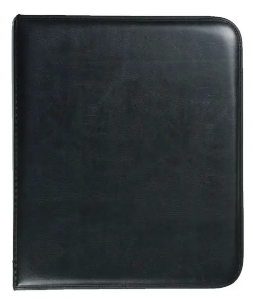 formát A4 • luxusní • imitace černé kůže • obšité • čtyřkroužková mechanika • uzavíratelné zipem • hřbet 35 mm • kapsa na poznámkový blok • psací podložka A4 s klipem • kapsa na kreditní karty a doklady • vložky na vizitky a CD • úchyty na psací potř