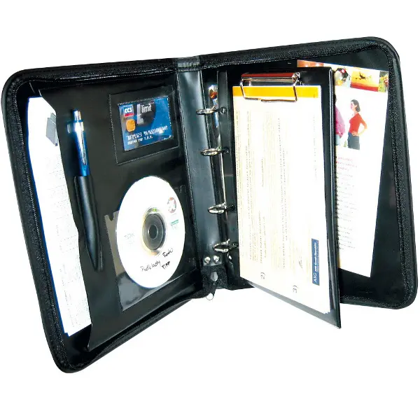 formát A5 • imitace kůže v matném provedení • čtyřkroužková mechanika • uzavíratelné zipem • hřbet 40 mm • psací podložka A5 s klipem • kapsa na poznámkový blok A5 • kapsa na kreditní karty a doklady • vložky na vizitky a CD • úchyty na psací potřeby