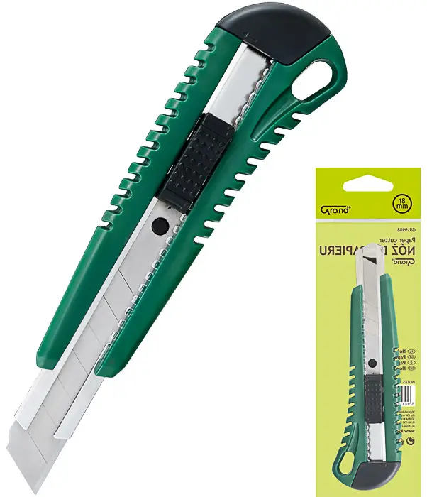 masivní odlamovací nůž s plastovým tělem, kovová vodicí lišta, posuvné ostří s blokací, šířka nože 18 mm