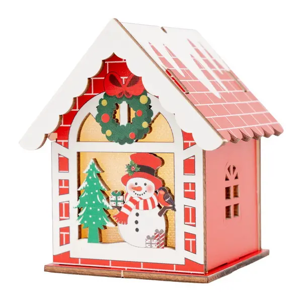 dřevěná stavebnice k setstavení domečku, velikost sestaveného domečku 9 x 7,5 cm, lehce sestavitelné, součástí je lampička a 3 baterie LR1130