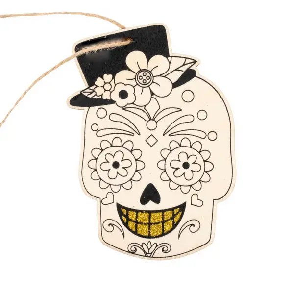 Jedná se o originální dřevěnou závěsnou ozdobu, která je určena k vlastnímu vymalování a kreativnímu dotvoření. Ozdoba má tvar stylové mexické lebky (Sugar Skull) s kloboukem, květy a úsměvem, přičemž zuby jsou zvýrazněny zlatým glitrovým lakem. Je vyrobena z přírodního dřeva a je ideální k dekoraci do interiéru, jako dárková visačka nebo jako zábavný projekt pro děti i dospělé. V horní části je opatřena jutovým provázkem pro snadné zavěšení. Velikost ozdoby je 13 cm.