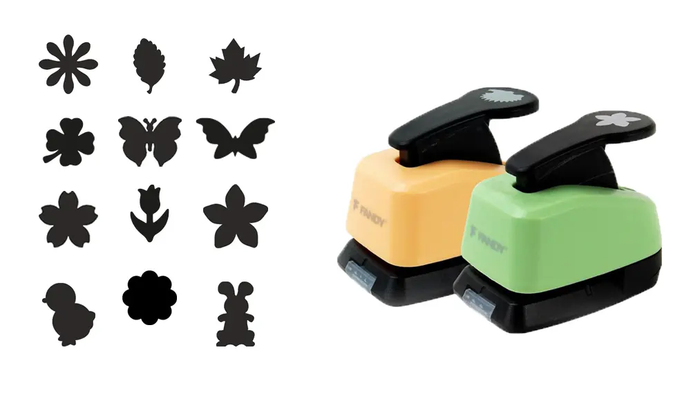 24 ks děrovaček dekoračních s pružinovým mechanismem pro snadné děrování, vhodné i pro děti, děrovačky proseknou i silnější materiál, například 2mm mechovou pryž a 300g papír, mix 12 motivů, velikost výseku 16 mm