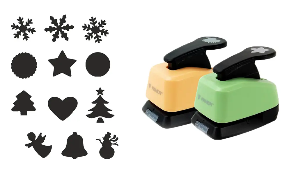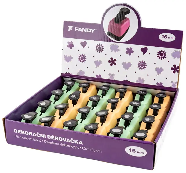 24 ks děrovaček dekoračních s pružinovým mechanismem pro snadné děrování, vhodné i pro děti, děrovačky proseknou i silnější materiál, například 2mm mechovou pryž a 300g papír, mix 12 motivů, velikost výseku 16 mm