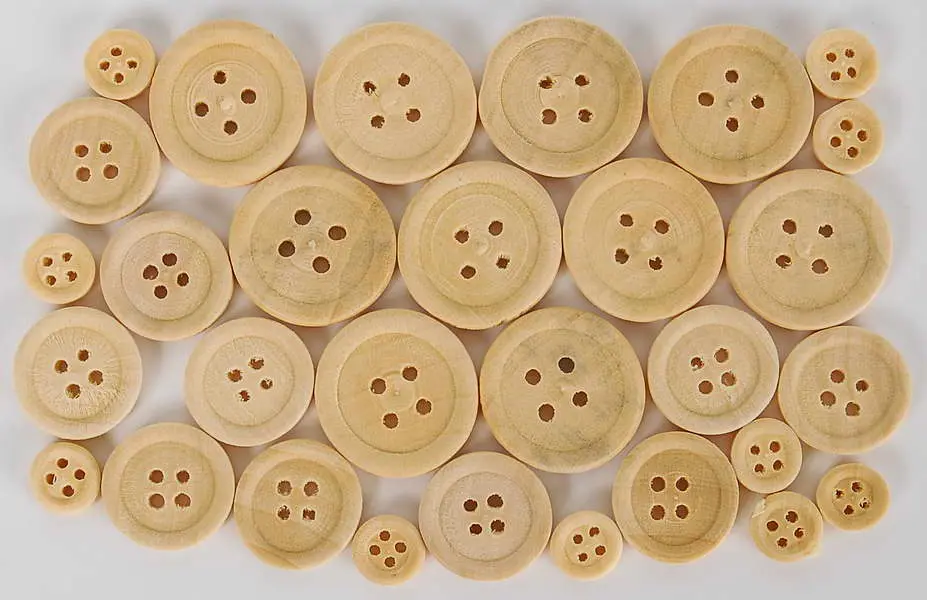 dřevěné dekorační knoflíky, přírodní barva, mix velikostí – 10 x 1 cm, 10 x 1,5 cm, 10 x 2 cm, v balení 30 ks