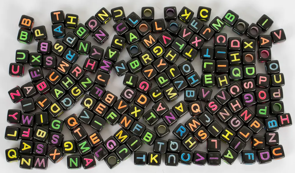 korálky ve tvaru kostek s písmeny, velikost 6 mm, v balení 30 g