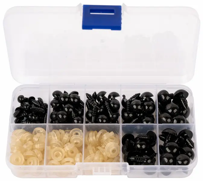 vysoce kvalitní plastové očka s pojistkou, pro různé kreativní práce, snadná instalace přišroubováním nebo vtlačením do látky, balení obsahuje 100 oček v několika velikostech a stejný počet pojistek