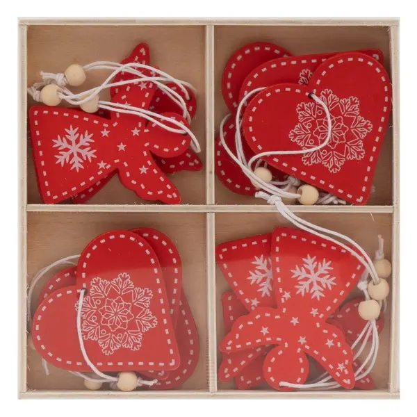 12 ks dřevěné dekorace v krabičce, velikost dekorace 5,5 cm, velikost krabičky 13,8 x 13,8 cm