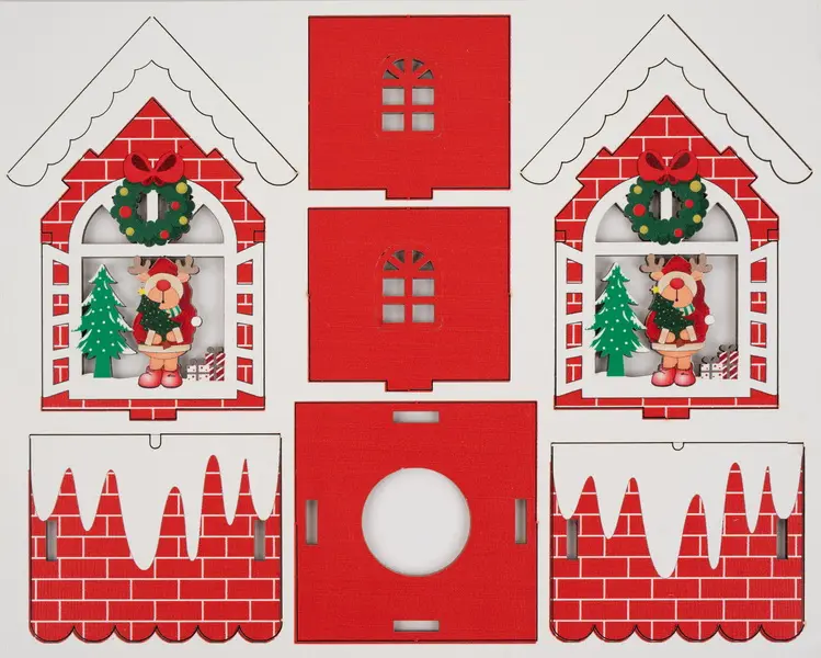 dřevěná stavebnice k setstavení domečku, velikost sestaveného domečku 9 x 7,5 cm, lehce sestavitelné, součástí je lampička a 3 baterie LR1130