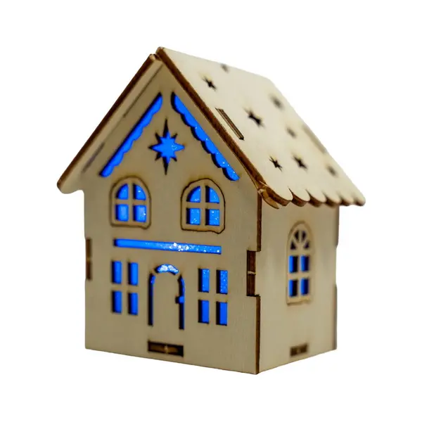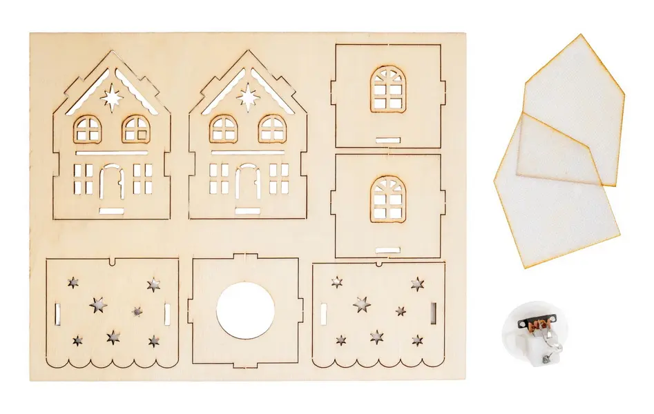 dřevěná stavebnice k setstavení domečku, velikost sestaveného domečku 9 x 7,5 cm, lehce sestavitelné, součástí je lampička a 3 baterie LR1130