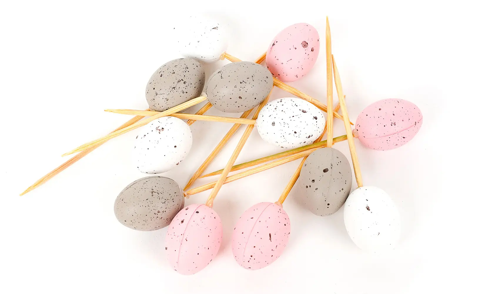 velikonoční vajíčka na špejli, v jemných barvách bílé, béžové a růžové, velikost 2,5 x 2 cm., 12 ks v balení