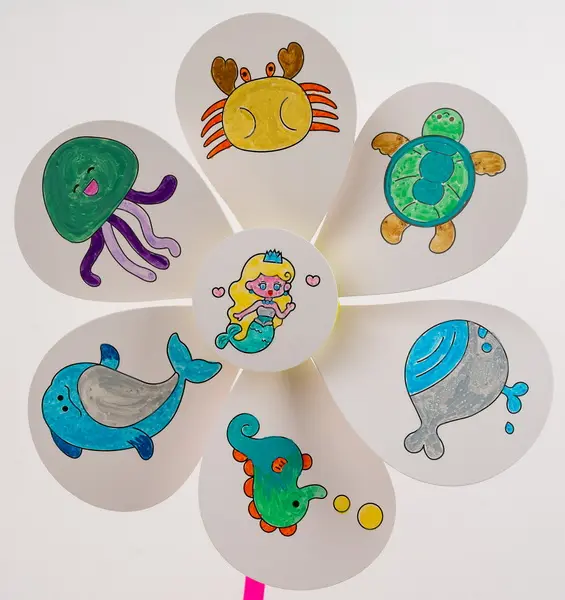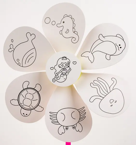 papírový větrník s předlohou pro vymalování, k dekoraci , 6 cípů, středové kolečko, tyčka, celková délka složeného větrníku 38,5 cm