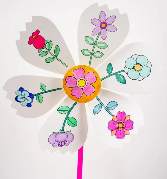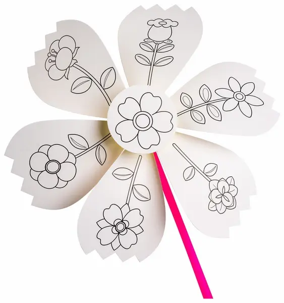 papírový větrník s předlohou pro vymalování, k dekoraci , 6 cípů, středové kolečko, tyčka, celková délka složeného větrníku 38,5 cm