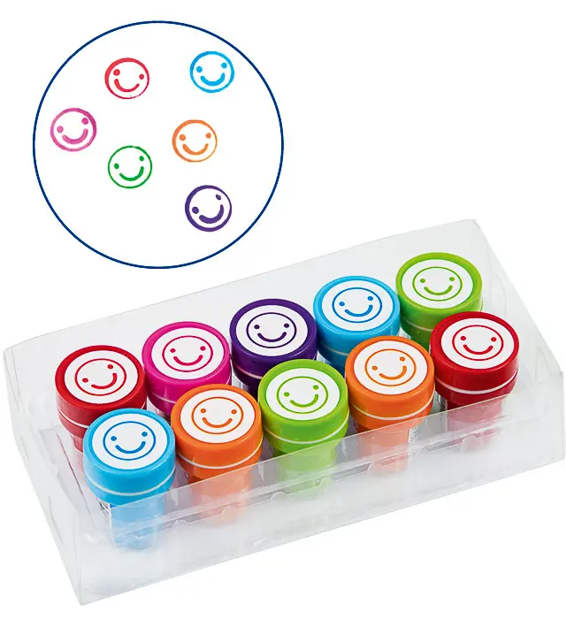 dětská razítka s motivem emotikonů s úsměvem, samotiskací, jednoduchá manipulace, průměr tisku cca 2 cm, v 6 barvách