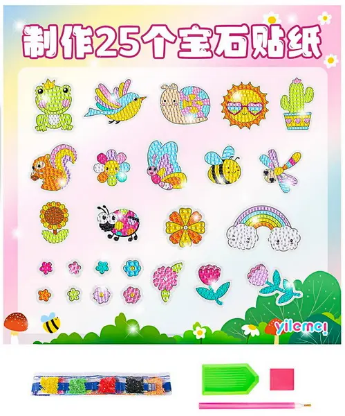 samolepící předlohy, rozvíjí trpělivost, sada obsahuje předlohy, akrylové kamínky, rozdělené dle barev, plastovou nádobku pro snadnější manipulaci s kamínky, plastový nástroj pro jejich aplikaci na předlohy