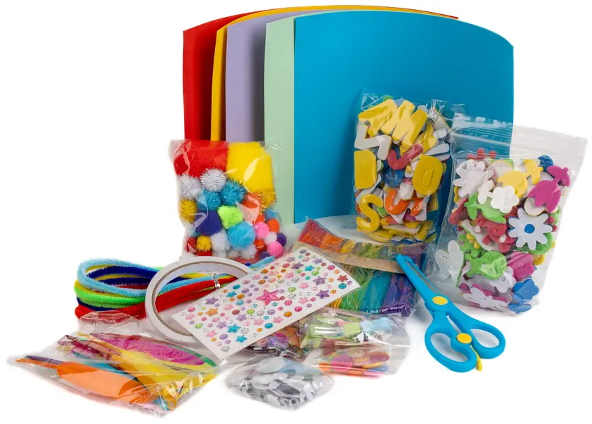 velká kreativní sada, obsahuje tvrdé papíry, nůžky, oboustranně lepící pásku, bambulky, pírka, dřívka, knoflíky, drátky, pěnové samolepky - písmenka, kytičky, zvířátka, samolepicí oči, samolepicí kamínky, flitry, baleno v praktické dóze