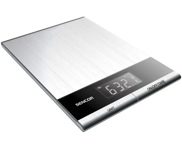 ultra slim design • nerezový povrch pro snadnou údržbu • extra velký LCD displej s kontrastním podsvícením • váživost do 5 kg • tara • 4 senzory pro vyšší přesnost vážení • rozlišení 1 g • možnost volby jednotek • indikace slabé baterie a přetížení •