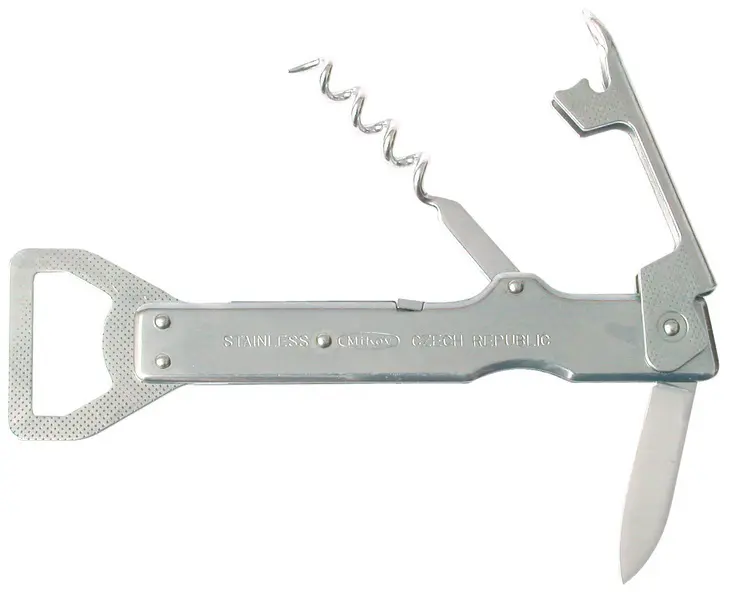 číšnický • celokovový • velmi kvalitní nerezová ocel • 3 funkce • kvalitní vývrtka, otvírač na korunkové uzávěry • kvalitní nerezová čepel • praktický, skladný a odolný korozi